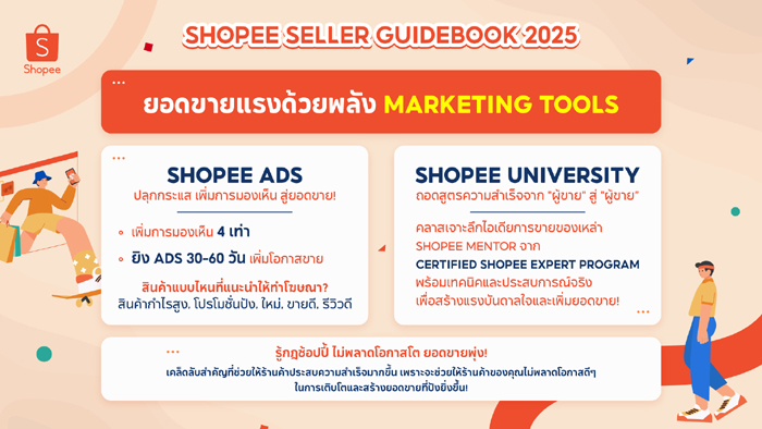 เพื่อให้ผู้ขายก้าวสู่ความสำเร็จ “Shopee Seller Guidebook: ความลับขายดี การันตียอดปัง(บนอีคอมเมิร์ซ) 2025” จากช้อปปี้ จึงรวบรวมทริคและเคล็ดลับจากมือโปร ช่วยให้ผู้ขายสร้างความได้เปรียบเหนือคู่แข่งและเพิ่มยอดขายให้ถึงเป้าหมาย เหมาะสำหรับทั้งมือใหม่และผู้ขายที่ต้องการพัฒนาธุรกิจอีคอมเมิร์ซ ด้วยเทคนิคที่ใช้ได้จริง และเครื่องมือที่สามารถผสมผสานเพื่อสร้างผลลัพธ์ที่ดีที่สุด