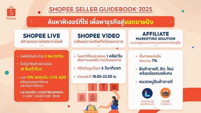 สำหรับ “Shopee Seller Guidebook: ความลับขายดี การันตียอดปัง(บนอีคอมเมิร์ซ) 2025” เป็นคู่มือสุดครบครันที่เต็มไปด้วยเทคนิคการปั้นยอดขายสุดปัง สร้างความแตกต่างที่ตอบโจทย์ผู้บริโภค และชูจุดเด่นของธุรกิจท่ามกลางการแข่งขันที่ดุเดือด เพื่อสนับสนุนแบรนด์ธุรกิจและผู้ประกอบการท้องถิ่นให้ประสบความสำเร็จและเติบโตอย่างยั่งยืน ช้อปปี้จะยังคงมุ่งมั่นที่จะช่วยผลักดันให้ธุรกิจไทยเติบโตอย่างยั่งยืน ผ่านการพัฒนาแพลตฟอร์มอีคอมเมิร์ซเพื่อสร้างอีโคซิสเต็มการช้อปปิ้งออนไลน์ที่สมบูรณ์แบบและตอบโจทย์ความต้องการของผู้ขายและผู้บริโภคอย่างแท้จริง พร้อมเดินหน้าสานต่อพันธกิจในการขับเคลื่อนเศรษฐกิจดิจิทัลอย่างยั่งยืน