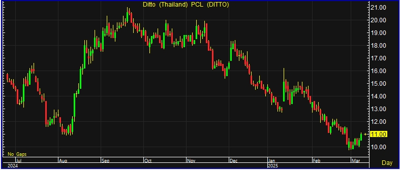 ผู้สื่อข่าวรายงานว่า วันนี้(10 มี.ค.68) ราคาหุ้นบริษัท ดิทโต้ (ประเทศไทย) จำกัด (มหาชน) หรือ DITTO ณ เวลา 10:26 น.อยู่ที่ระดับ 11.00 บาท บวก 0.50 บาท หรือ 4.76% ราคาต่ำสุด 10.50 บาท ราคาสูงสุด 11.10 บาท ด้วยมูลค่าซื้อขาย 25.87 ล้านบาท