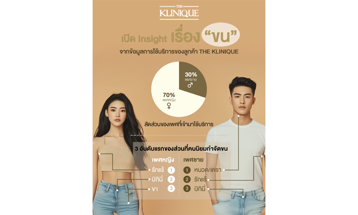 THE KLINIQUE (เดอะคลีนิกค์) คลินิก เวชกรรม จำกัด (มหาชน) ตอกย้ำความเป็นผู้นำคลีนิกความงาม พร้อมบุกตลาดบริการกำจัดขนที่ยกระดับตลาดด้วยการสร้างมาตรฐานใหม่ให้กับอุตสาหกรรมการแพทย์และความงาม รองรับแนวโน้มการเติบโตของกลุ่มบริการกำจัดขนของ THE KLINIQUE ที่มีสัดส่วนถึง 30% เปิดกลยุทธ์ Music Marketing สร้างความแตกต่างของแบรนด์ด้วย “ลูกทุ่งติดแกลม” ที่ทำให้ “ขน” เป็นสิ่งที่สามารถพูดถึงได้อย่างเปิดเผยแนบเนียนอย่างเป็นธรรมชาติผ่านเพลง “ถ้าพี่ไม่ชัวร์ (หนูอยากโดน…เล)” พร้อมเผย 3 อันดับนิยามความงามของคนไทยเทียบกับทั่วโลก ซึ่งพบว่าไทยเป็นประเทศเดียวที่ให้ความสำคัญกับ “สวยติดแกลม” มากถึงอันดับ 2