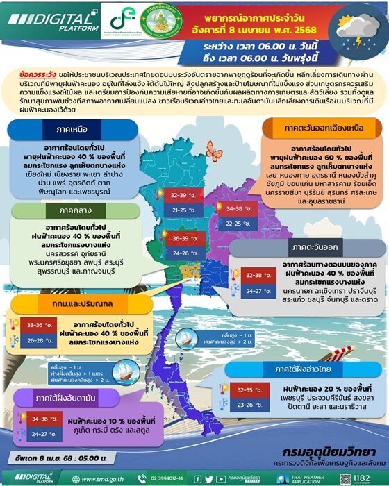 วันที่ 8 เม.ย.2568 กรมอุตุนิยมวิทยา พยากรณ์อากาศ 24 ชั่วโมงข้างหน้า ประเทศไทยตอนบนมีพายุฤดูร้อนเกิดขึ้น โดยมีลักษณะของพายุฝนฟ้าคะนอง ลมกระโชกแรง และลูกเห็บตกบางแห่ง