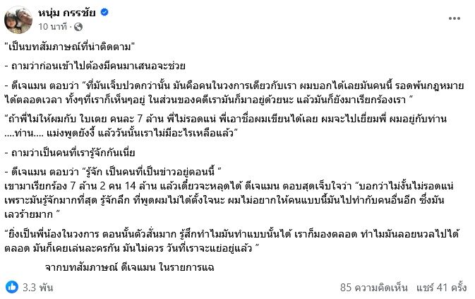 จากกรณีหนุ่ม กรรชัย โพสต์บทสัมภาษณ์ ดีเจเมน พัฒนพล เปิดใจเจ็บปวดแฉดาราดังเรียกเงิน 14 ล้าน จะช่วยหลุดคดี ทั้งที่ตัวเองกำลังอยู่ในจุดที่แย่มากๆว่า