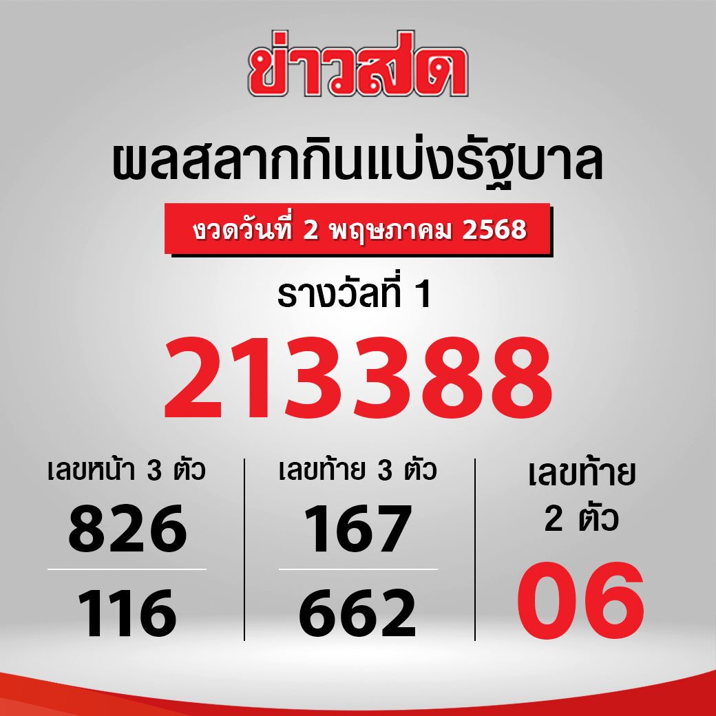 หลังจากสำนักงานสลากกินแบ่งรัฐบาล ออกรางวัลงวดประจำวันที่ 2 พ.ค.2568 โดยงวดนี้รางวัลที่ 1 ออกหมายเลข 213388 รางวัลเลขหน้า 3 ตัว ออกหมายเลข 826 , 116 เลขท้าย 3 ตัว ออก 167 , 662 และรางวัลเลขท้าย 2 ตัว ออกหมายเลข 06