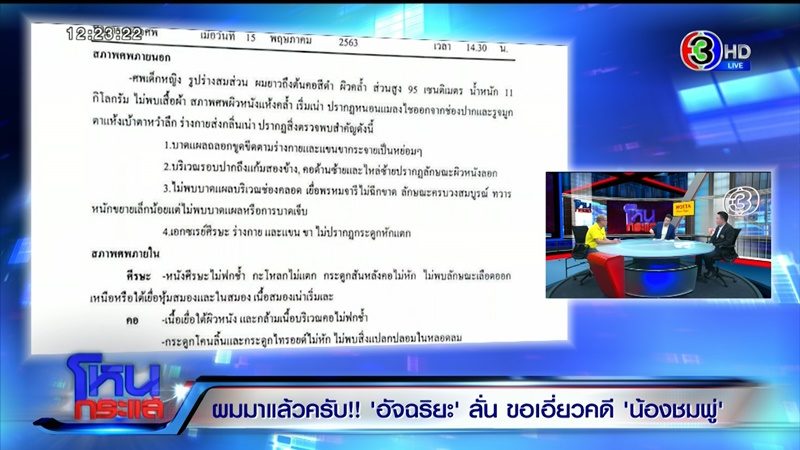สืบจากศพชมพู่โวรู้แล้วใครฆ่า - รายการโหนกระแส วันที่ 21 ก.ค. หนุ่ม กรรชัย กำเนิดพลอย ในฐานะผู้ดำเนินรายการ ผลิตในนามบริษัท ดีคืนดีวัน จำกัด ออกอากาศทุกวันจันทร์-ศุกร์ เวลา 12.20 น. ทางช่อง 3 กดเลข 33 เปิดใจสัมภาษณ์ "อัจฉริยะ เรืองรัตนพงษ์" ประธานชมรมช่วยเหลือเหยื่ออาชญากรรม และ "รศ.นพ. วีระศักดิ์ จรัสชัยศรี" แพทย์ผู้เชี่ยวชาญด้านนิติเวชศาสตร์ มศว. กรณี "น้องชมพู่" กับการเสียชีวิตที่ยังเป็นปริศนา ซึ่งล่าสุดนายอัจฉริยะได้ออกมาเผยหลักฐานใหม่