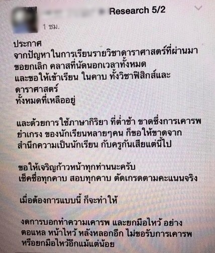 ความคืบหน้า เมื่อวันที่ 9 มี.ค. ครูหื่นโพสในเฟซบุ๊กถึง Research 5/2 ระบุว่า ประกาศจากปัญหาในการเรียนรายวิชาดาราศาสตร์ที่ผ่านมา ขอยกเลิกคลาสที่นัดนอกเวลาทั้งหมดและขอให้เข้าเรียน ในคาบ ทั้งวิชาฟิสิกส์และดาราศาสตร์ทั้งหมดที่เหลืออยู่ และด้วยการใช้ภาษากริยา ที่ต่ำช้า ขาดซึ่งการเคารพ ยำเกรงของนักเรียนหลายๆคน ก็ขอให้ขาดจากสำนึกความเป็นนักเรียนกับครูกันเสียแต่นี้ไป