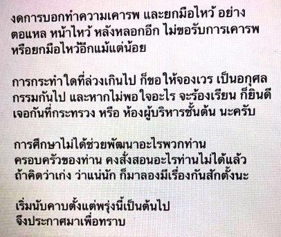 การกระทำใดที่ล่วงเกินไป ก็ขอให้จองเวรเป็นอกุศลกรรมกันไปและหากไม่พอใจอะไร จะร้องเรียนก็ยินดีเจอกันที่กระทรวงหรือห้องผู้บริหารชั้นต้นนะครับ การศึกษาไม่ได้ช่วยพัฒนาอะไรพวกท่าน ครอบครัวพวกท่าน คงสั่งสอนอะไรท่านไม่ได้แล้ว ถ้าคิดว่าเก่ง ว่าแน่นัก ก็มาลองมีเรื่องกันสักตั้งนะ เริ่มนับคาบตั้งแต่พรุ่งนี้เป็นต้นไป จึงประกาศมาเพื่อทราบ