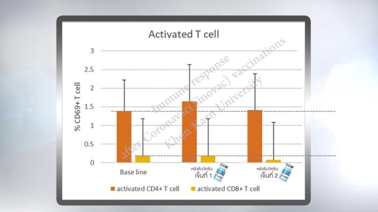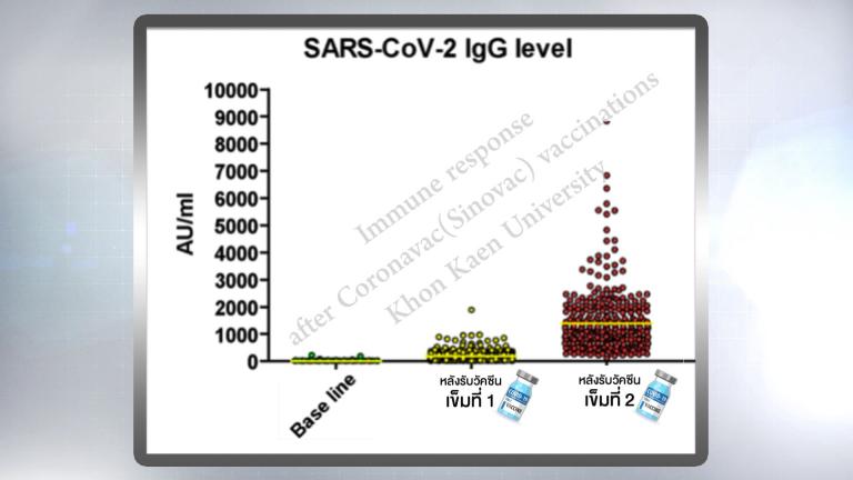 “ผลวิจัยการตรวจภูมิคุ้มกันของผู้ที่รับวัคซีน Sinovac เป็นการศึกษาแอนติบอดี และ ทีเซลล์ของผู้ที่รับวัคซีน Sinovac ประกอบด้วย แพทย์ พยาบาล นักศึกษาแพทย์ เจ้าหน้าที่ที่เกี่ยวข้อง จำนวน 335 คน โดยเก็บข้อมูลจากการ เจาะเลือด ทั้งหมด 3 ครั้ง ครั้งที่ 1 ก่อนฉีดวัคซีน ครั้งที่ 2 หลังจากฉีดวัคซีนเข็มแรก ครั้งที่ 3 หลังจากฉีดวัคซีนเข็มสอง 1 เดือน (รูปที่ 1) อาสาสมัครที่ได้รับวัคซีนสามารถสร้างแอนติบอดีที่จำเพาะต่อโปรตีนของเชื้อได้ ร้อยละ 89 หลังจากรับวัคซีนเข็มแรก และหลังจากรับวัคซีนครบ 2 เข็ม สามารถตรวจวัดระดับปริมาณของแอนติบอดีที่จำเพาะได้ครบทุกคน (100%) ในปริมาณที่แตกต่างกันโดยมีค่ากลางอยู่ที่ 1292 AU/ml (รูปที่ 1) ส่วนผลการศึกษาทีเซลล์พบว่ามีปริมาณที่ถูกกระตุ้นของ CD4+ T cell ในอาสาสมัครหลังรับวัคซีนสูงขึ้นเล็กน้อยหลังฉีดในขณะที่ CD8+ T cell ไม่เปลี่ยนแปลงเมื่อเทียบกับก่อนฉีดวัคซีน (รูปที่ 2)”