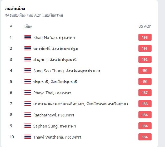จังหวัดปทุมธานี 191 มคก./ลบ.ม. พญาไท กรุงเทพฯ 187 มคก./ลบ.ม. เทศบาลนครพระนครศรีอยุธยา, จังหวัดพระนครศรีอยุธยา 186 มคก./ลบ.ม. Ratchathewi, กรุงเทพฯ 184 มคก./ลบ.ม. สะพานสูง กรุงเทพฯ 184 มคก./ลบ.ม. ทวีวัฒนา กรุงเทพฯ 184 มคก./ลบ.ม.