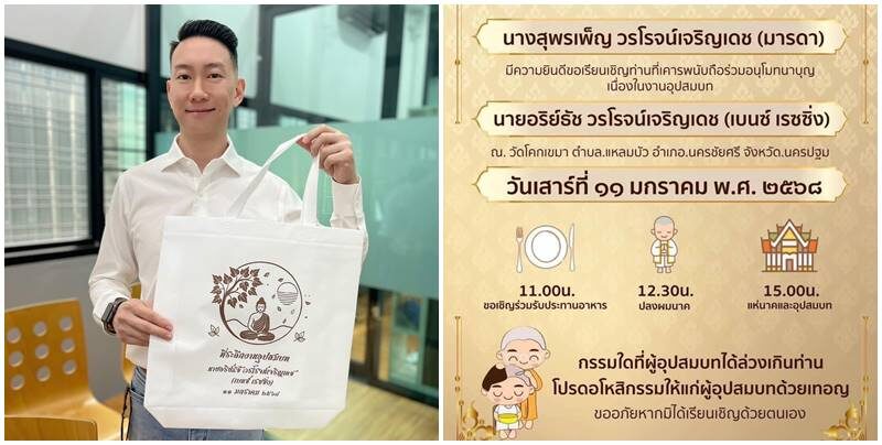 โดยระบุว่า “ในวันพรุ่งนี้ 11/01/2568 กระผมเบนซ์ เรซซิ่ง ขออนุญาตลาอุปสมบทเป็นระยะเวลาสามเดือน เพื่อไปศึกษาในพระธรรม และตอบแทนพระคุณบิดามารดา และผู้มีอุปการะคุณทั้งหลาย กรรมใดๆ ที่ข้าพเจ้าได้เคยล่วงเกินแก่ท่านใดไว้ ขอได้โปรดช่วยอโหสิกรรมให้แก่ข้าพเจ้า และหากกรรมใดที่ใครเคยทำแก่ข้าพเจ้าไว้ ข้าพเจ้าขออโหสิกรรมให้ทั้งสิ้น”