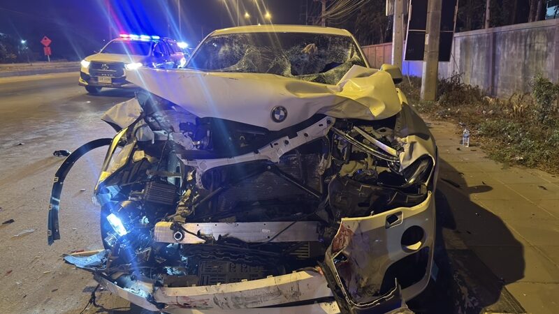 BMW เสยท้ายกระบะ หนุ่มยืนติดป้ายข้างทาง ถูกอัดก็อปปี้ร่างเสียชีวิต