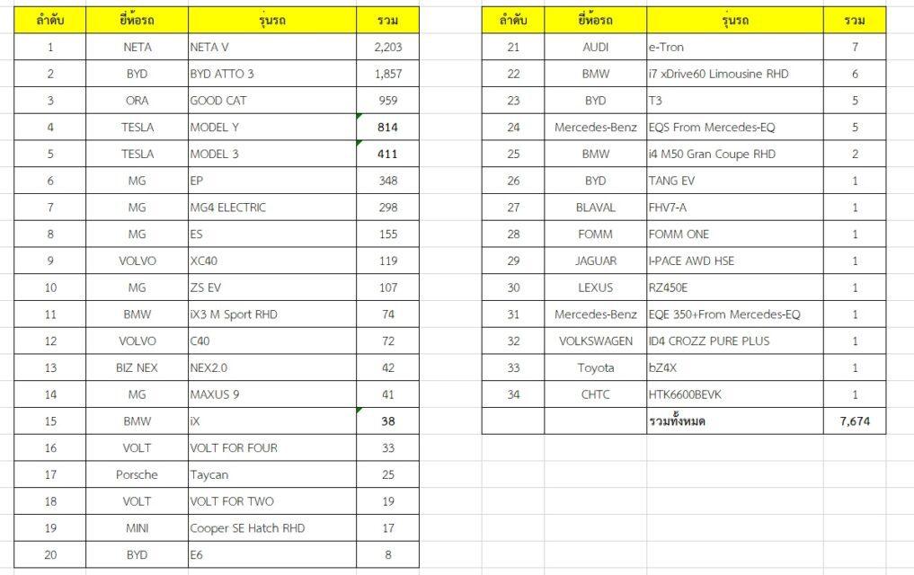 โดยตัวเลขยอดจดทะเบียนของเดือนพฤษภาคมกับมิถุนายน แบ่งเป็นกลุ่มรถยนต์นั่งส่วนบุคคลไม่เกิน 7 คน (รย.1), รถยนต์รถยนต์นั่งส่วนบุคคลเกิน 7 คน (รย.2), รถบรรทุกส่วนบุคคล (รย.3), รถยนต์สามล้อส่วนบุคคล (รย.4), รถยนต์รับจ้างบรรทุกคนโดยสารไม่เกิน 7 คน (รย.6) และรถยนต์รับจ้างสามล้อ (รย.8) และ รถยนต์บริการทัศนาจร (รย.10) และถ้าจัดอันดับรุ่นรถยนต์ไฟฟ้าที่มียอดจดทะเบียนมากที่สุดมีดังนี้