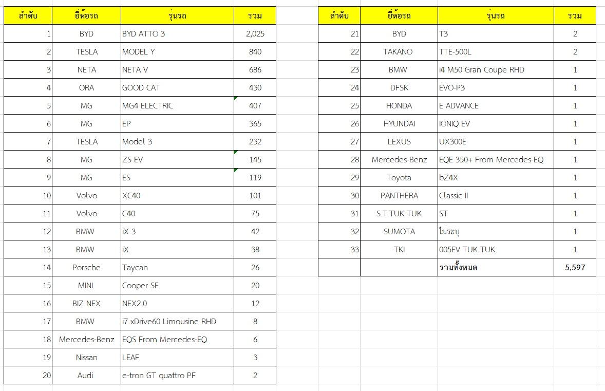 - อันดับ 1 อย่าง BYD จำหน่ายโดยกลุ่ม Rêver ที่ได้จำนวนทั้งหมด 2,027 คัน แบ่งเป็น BYD ATTO 3 แบ่งเป็นรุ่น Extended Range 1,812 คัน, รุ่น Standard Range 213 คัน กับ BYD T3 2 คัน