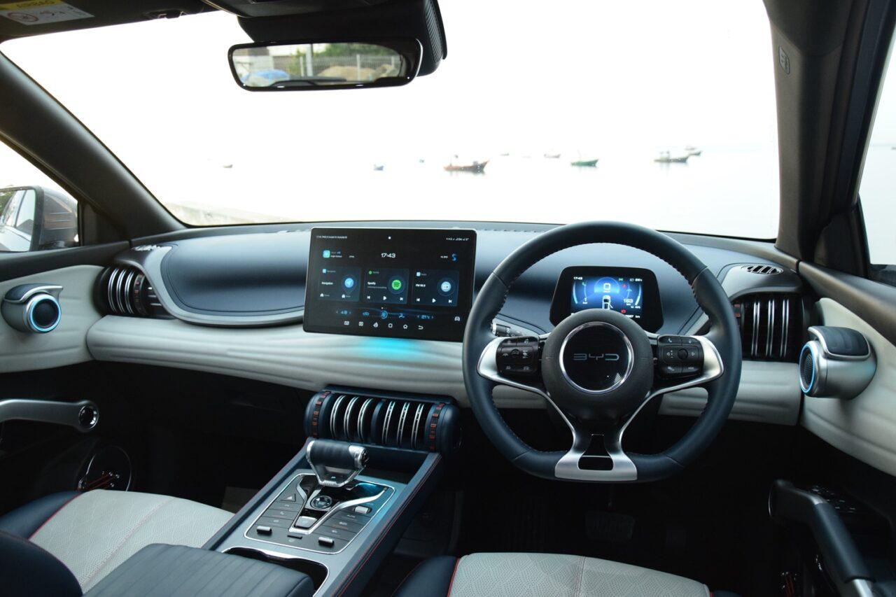 BYD ATTO 3 ได้เปรียบตรงที่พื้นฐาน BYD’s e-platform 3.0 สำหรับรถไฟฟ้าโดยเฉพาะ การใช้งานคล้ายกับรถเครื่องสันดาปตั้งแต่สตาร์ทรถยันจอดรถด้วยปุ่ม Push Start คอนโซลหน้าทรงเท่สีทูโทน พวงมาลัยมัลติฟังก์ชัน 3 ก้านปรับได้ 4 ทิศทางพร้อมสวิตช์ควบคุมเครื่องเสียง และสวิตช์ควบคุมหน้าจอ หน้าจอมีสองตำแหน่งแยกกันทั้งมาตรวัดความเร็วดิจิทัลขนาด 5 นิ้ว หน้าจอสัมผัสขนาดใหญ่ 12.8 นิ้ว หมุนจอได้ทั้งแนวตั้งและแนวนอน เชื่อมต่อ Apple Car Play แต่ Android Auto ไม่สามารถเชื่อมต่อได้ พร้อมลำโพง Dirac HD Sound 8 จุด ที่ชาร์จมือถือไร้สาย เชื่อมต่ออัจฉริยะ BYD DiLink แสดงผลการขับขี่