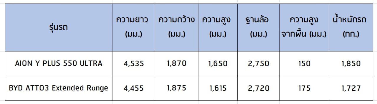 ถึงจะเป็นรถท้ายตัด 5 ประตู แต่สไตล์คนละแบบและเมื่อดูจากทุกส่วนของตัวรถทั้งสองคันพบกว่า AION Y Plus 550 Ultra ได้เปรียบเกือบทุกส่วนเมื่อเทียบกับ BYD ATTO 3 Extended Range ตั้งแต่ความยาวมากกว่า ATTO3 ถึง 80 มิลลิเมตร สูงกว่า ATTO3 ถึง 35 มิลลิเมตร ฐานล้อยาวกว่า ATTO3 ถึง 30 มิลลิเมตร 70 มม. น้ำหนักรถหนักกว่า ATTO3 ถึง 123 กิโลกรัม แต่บางจุดด้อยกว่า ATTO3 ตั้งแต่ความกว้างกว่า Y Plus 5 มิลลิเมตร และความสูงจากใต้ท้องรถสูงกว่า Y Plus 25 มิลลิเมตร
