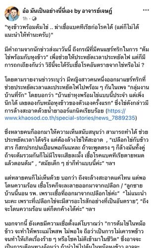 "หุงข้าวพร้อมต้มไข่ ฆ่าเชื้อแบคทีเรียก่อโรคได้ (แต่ก็ไม่ได้แนะนำให้ทำนะครับ) มีคำถามจากนักข่าวส่งมาวันนี้ ถึงกรณีที่มีคนแชร์ทริคในการ ต้มไข่พร้อมกับหุงข้าว เพื่อช่วยให้ประหยัดเวลาประหยัดไฟ แต่ก็มีการถกเถียงกันว่า วิธีนี้จะได้รับเชื้อโรคอันตรายจากไข่หรือไม่