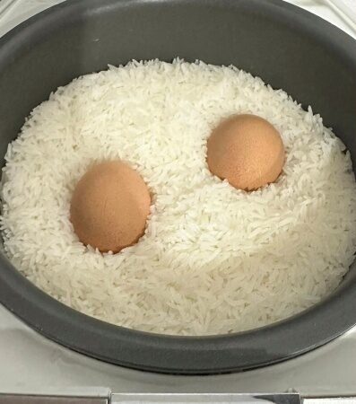 ใส่ข้าวสารและน้ำในหม้อหุงข้าวไฟฟ้าตามสัดส่วนปกติ วางไข่ลงไปบนข้าว และเพิ่มน้ำลงไปอีกประมาณครึ่งถ้วย เพื่อให้เพียงพอที่จะให้ความร้อนกับไข่ทั้งฟองได้ ทำการหุงตามปรกติ จนข้าวสุก สามารถนำมาบริโภคได้