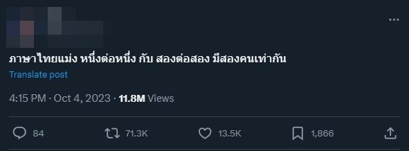 ล่าสุดมีผู้ใช้ X (ทวิตเตอร์) รายหนึ่ง ได้โพสต์ข้อความระบุว่า "ภาษาไทยแม่ง หนึ่งต่อหนึ่ง กับ สองต่อสอง มีสองคนเท่ากัน" แล้วกลายเป็นไวรัล มียอดรับชมกว่า 11 ล้าน รีโพสต์มากกว่า 6 หมื่นครั้ง และเข้ามาแสดงความคิดเห็นมากมายถึง "ความดิ้นได้ของภาษาไทย"
