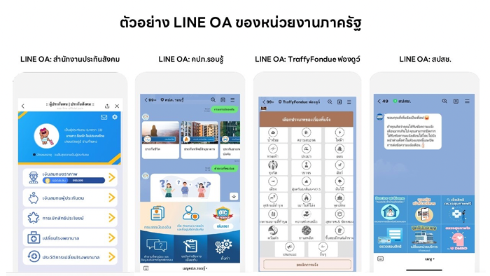 หน่วยงานภาครัฐจำนวนมากในไทย มีการใช้ LINE OA เป็นช่องทางหลักทั้งในการสื่อสารและให้บริการประชาชนแบบ One Stop Service ซึ่งได้รับการตอบรับที่ดี มีประชาชนติดตามเป็นจำนวนมาก อาทิ LINE OA ‘สำนักงานประกันสังคม’ ศูนย์กลางในการสื่อสารสิทธิประโยชน์สู่ผู้ประกันตน และศูนย์ข้อมูลสำหรับผู้ประกันตนในการตรวจสอบ อัปเดตข้อมูลส่วนตัวได้อย่างสะดวก ปลอดภัย LINE OA ‘คปภ.รอบรู้’ ของ คปภ. ศูนย์ข้อมูลให้ผู้ใช้สามารถเข้าถึงกรมธรรม์ประกันภัยทั้งหมดที่อยู่ภายใต้การกำกับได้อย่างสะดวก รวดเร็ว LINE OA ‘TraffyFondue ฟองดูว์’ ของกทม. ศูนย์รับแจ้งปัญหาความเดือดร้อนที่เกี่ยวข้องตามพื้นที่ต่างๆ ในกทม. และ LINE OA ‘สปสช.’ ที่ล่าสุด ได้เชื่อมต่อกับระบบบริการ Doctor at Home และ AI DMIND นำเอาเทคโนโลยี AI มาช่วยในการตรวจคัดกรอง ประเมินสุขภาพเบื้องต้น และให้องค์ความรู้ในการดูแลสุขภาพทั้งทางกายและทางใจผ่าน LINE นับเป็นการนำนวัตกรรมบริการสาธารณสุขวิถีใหม่มาให้บริการบน LINE OA ได้อย่างลงตัว เป็นต้น