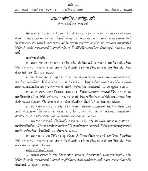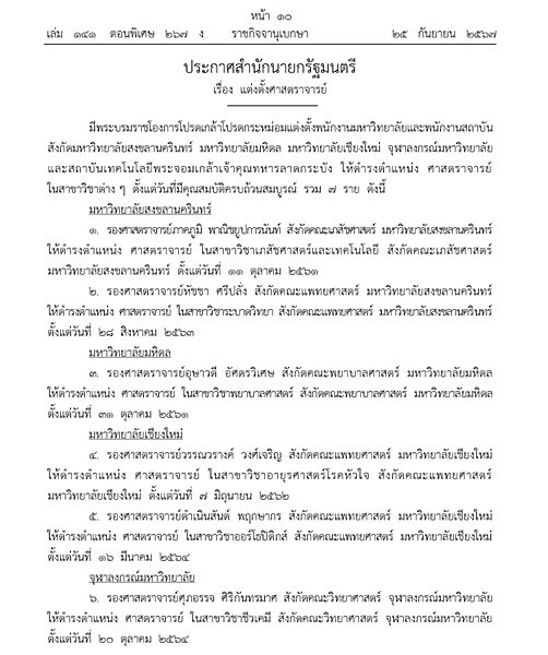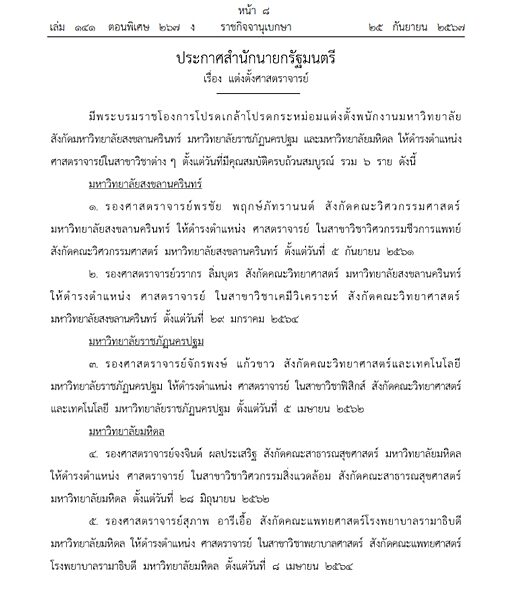 มีพระบรมราชโองการโปรดเกล้าโปรดกระหม่อมแต่งตั้งพนักงานมหาวิทยาลัย สังกัดมหาวิทยาลัยสงขลานครินทร์ มหาวิทยาลัยราชภัฏนครปฐม และมหาวิทยาลัยมหิดล ให้ดำรงตำแหน่ง ศาสตราจารย์ ในสาขาวิชาต่าง ๆ ตั้งแต่วันที่มีคุณสมบัติครบถ้วนสมบูรณ์ รวม 6 ราย ดังนี้