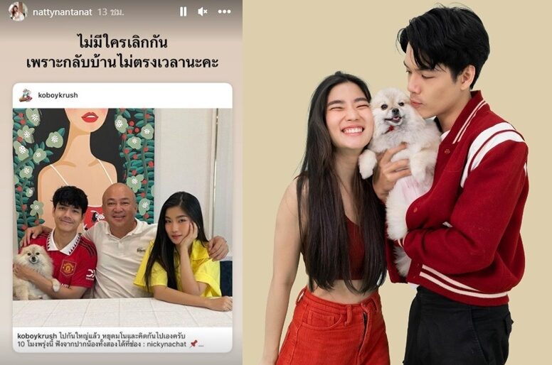 ▪️ “นัตตี้” รีโพสต์สตอรี่ของวีพร้อมแคปชั่นเพิ่มว่า “น้องคะ…” และโพสต์อีกข้อความว่า “ไม่มีใครเลิกกันเพราะกลับบ้านไม่ตรงเวลานะคะ”