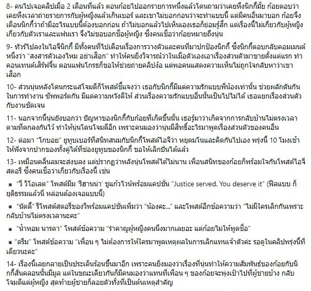 14- เรื่องนี้เลยกลายเป็นประเด็นร้อนขึ้นมาอีก เพราะคนยิ่งมองว่าเรื่องที่นุ่นทำให้ความสัมพันธ์ของก้อยกับนิกกี้สั่นคลอนนั้นมีมูล แต่ในขณะเดียวกันก็มีคนมองว่าแทนที่เพื่อนๆ ของก้อยจะพุ่งเป้าไปที่ผู้ชายบ้าง กลับโจมตีแต่ผู้หญิง สุดท้ายผู้ชายก็ลอยตัวทั้งที่เป็นต้นเหตุสำคัญ