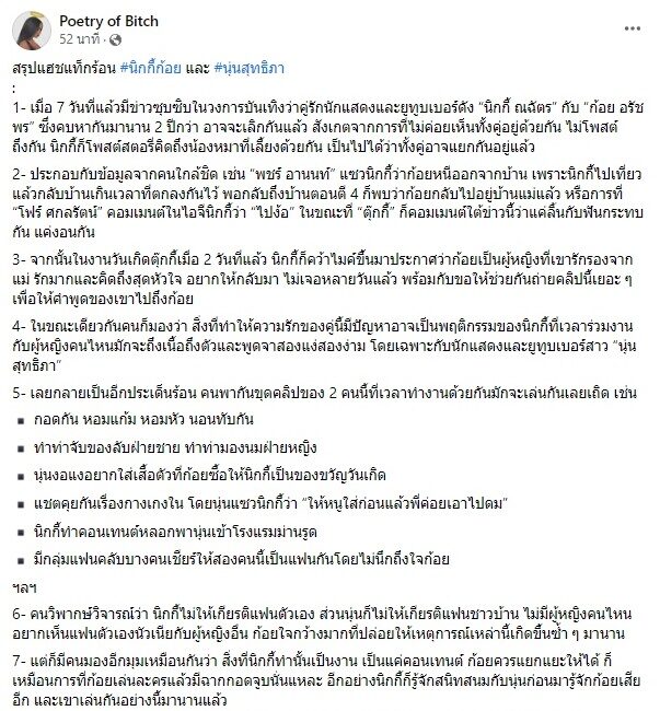ล่าสุด เพจดัง Poetry of Bitch ออกมาเล่าเรื่องราวที่ดราม่าสุดๆในตอนนี้ ของทั้งคู่ โดยไล่เรียงไทม์ไลน์ทั้งหมดแบบชัดๆสรุปจบให้ฟังตรงนี้เลยว่า สรุปแฮชแท็กร้อน #นิกกี้ก้อย และ #นุ่นสุทธิภา
