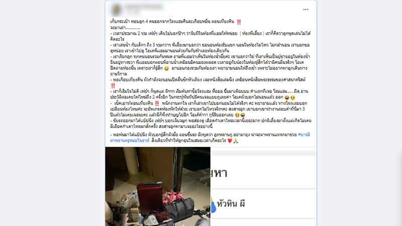 วันที่ 10 เม.ย.2566 ชาวเน็ตมีการแชร์ต่อและวิพากษ์วิจารณ์เรื่องราวที่เกิดขึ้นกับครอบครัวหนึ่ง หลังจากที่ต้องหอบข้าวของหนีออกจากโรงแรมหรูหัวหิน คืนละเกือบหมื่นกลางดึก เพราะเจอกับเหตุการณ์แปลกๆบางอย่าง โดยผู้ใช้เฟซบุ๊กรายหนึ่ง โพสต์ภาพพร้อมข้อความระบุว่า เก็บกระเป๋า หอบลูก 4 คนออกจากโรงเเรมคืนละเกือบหมื่น ตอนเที่ยงคืน