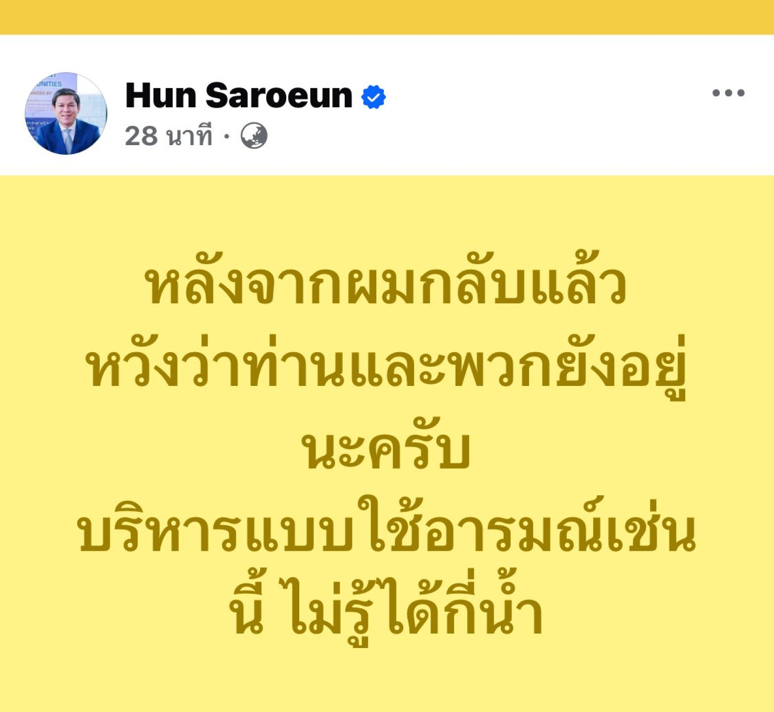 วันที่ 23 ก.ค.68 เฟซบุ๊กของ นายฮุน ซาเรือน (H.E. Mr. Hun Saroeun) เอกอัครราชทูตราชอาณาจักรกัมพูชาประจำประเทศไทย ได้ออกมาเคลื่อนไหวหลังรัฐบาลไทยมีมติส่งกลับกัมพูชา โดยระบุข้อความว่า “หลังจากผมกลับแล้ว หวังว่าท่านและพวกยังอยู่นะครับ บริหารแบบใช้อารมณ์เช่นนี้ ไม่รู้ได้กี่น้ำ”