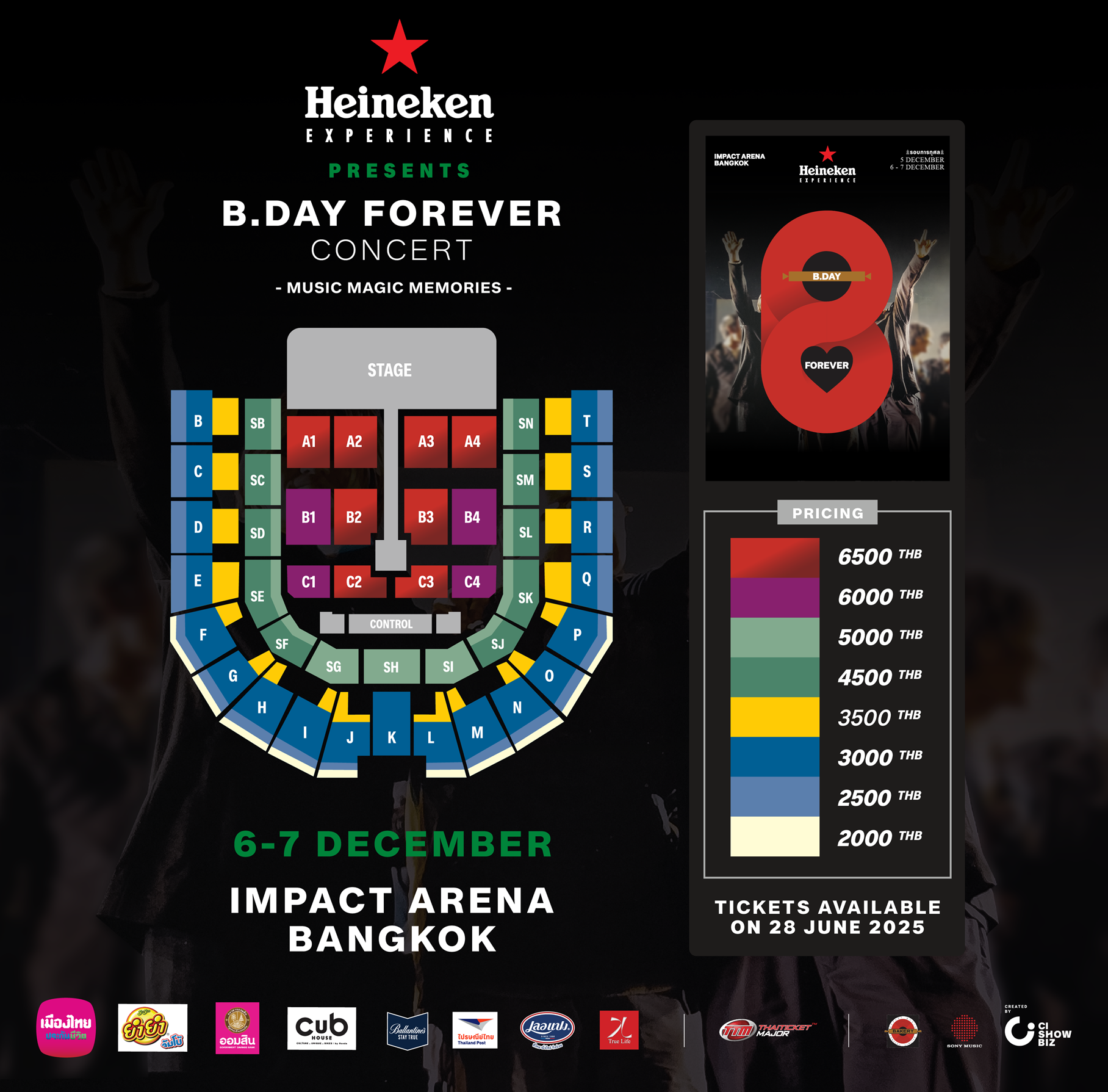 ครั้งนี้พวกเขาได้กลับมารวมตัวกันอย่างยิ่งใหญ่ ที่สุดของครอบครัว Bakery Music ต้นทางแห่งความทรงจำของผู้คนในยุค 90s และต้น 2000s ทุกบทเพลงฮิต ทุกเสียงร้องที่อยู่ในใจคุณ จะกลับมามีชีวิตอีกครั้ง บนเวทีเดียวกันเป็นครั้งแรกในรอบกว่า 20 ปี ชวนให้นึกถึงกลิ่นขนมปังอันอบอวล ในงาน Heineken Experience Presents "B.DAY Forever Concert" ชาว Bakerian ทุกคนจะได้ย้อนหัวใจกลับไปยังวันวานที่เคยรักในบทเพลงที่เป็นประวัติศาสตร์ ของพวกเราทุกคนผ่านคอนเสิร์ตฯ ในครั้งนี้ จัดขึ้นวันที่ 5 ธันวาคม 2568 (รอบการกุศล) และ วันที่ 6-7 ธันวาคม 2568 (รอบทั่วไป) ณ อิมแพค อารีน่า เมืองทองธานี ซึ่งสร้างสรรค์โดย CI Showbiz