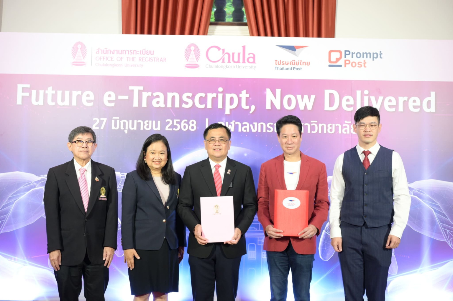 จุฬาลงกรณ์มหาวิทยาลัย ร่วมกับ บริษัท ไปรษณีย์ไทย จำกัด เปิดตัวระบบ “e-Transcript” หรือใบรับรองผลการศึกษาในรูปแบบดิจิทัลผ่านแอปพลิเคชัน Prompt Post เป็นครั้งแรกในประเทศไทย ในงานเสวนาวิชาการ Chula the Impact ครั้งที่ 34 “Future e-Transcript, Now Delivered” เมื่อวันที่ 27 มิ..ที่ผ่านมา เพื่อช่วยยกระดับการจัดส่งเอกสารการศึกษาให้รวดเร็ว ปลอดภัย รองรับการใช้งานได้ทุกที่ ทุกเวลา ผ่าน Digital Postbox ส่วนบุคคล พร้อมเดินหน้าขยายผลสู่สถาบันการศึกษาทั่วประเทศ เพื่อร่วมกันวางมาตรฐานกลางของเอกสารดิจิทัลสำหรับภาคการศึกษา และต่อยอดสู่การใช้งานในองค์กรภาครัฐและเอกชนในอนาคต