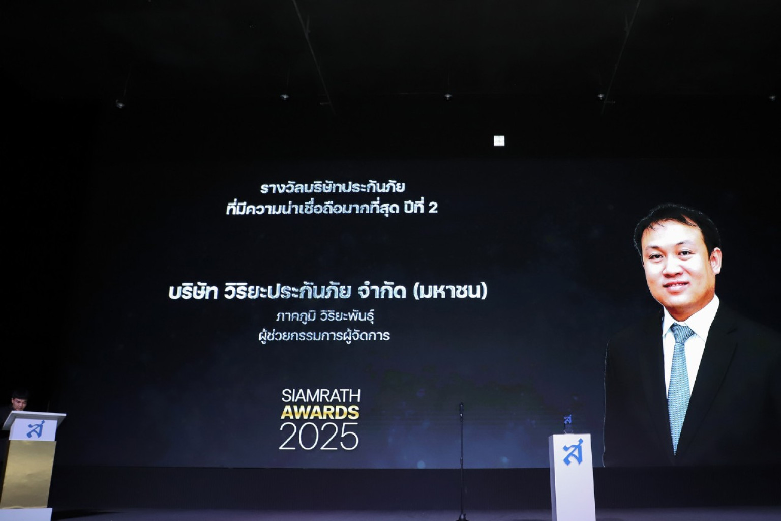 นายภาคภูมิ วิริยะพันธุ์ ผู้ช่วยกรรมการผู้จัดการ บริษัท วิริยะประกันภัย จำกัด (มหาชน) เป็นผู้แทนเข้ารับรางวัล “ประกันภัยที่มีความน่าเชื่อถือมากที่สุด” ต่อเนื่องเป็นปีที่ 2 ภายในงาน “SIAMRATH AWARDS 2025” สะท้อนถึงความเชื่อมั่นและความไว้วางใจที่ประชาชนมีต่อวิริยะประกันภัยอย่างต่อเนื่อง อันเป็นผลมาจากการดำเนินงานภายใต้หลัก “ความเป็นธรรม คือ นโยบาย” โดยมุ่งมั่นให้บริการประกันวินาศภัยที่มีคุณภาพ มีธรรมาภิบาลและความโปร่งใส ตลอดจนยึดมั่นในบทบาทของการเป็นองค์กรที่ขับเคลื่อนธุรกิจควบคู่ไปกับการสร้างคุณค่าให้กับสังคมอย่างยั่งยืน ณ Phenix Auditorium Hall แขวงถนนเพชรบุรี เขตราชเทวี กรุงเทพฯ