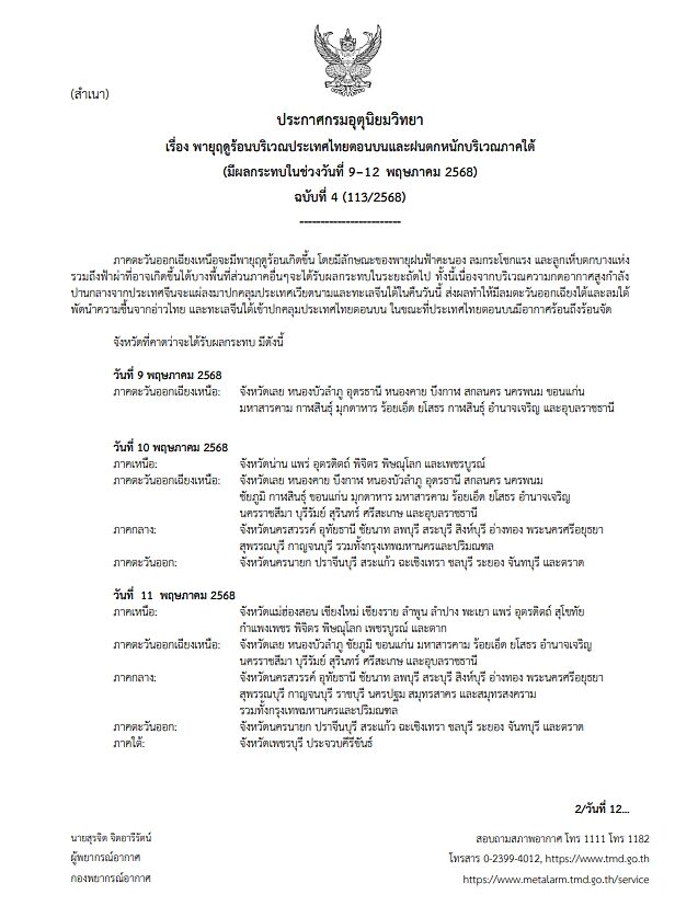 วันที่ 9 พ.ค.2568 กรมอุตุนิยมวิทยา ประกาศ เรื่อง พายุฤดูร้อนบริเวณประเทศไทยตอนบนและฝนตกหนักบริเวณภาคใต้ (มีผลกระทบในช่วงวันที่ 9-12 พฤษภาคม 2568) ฉบับที่ 4 (113/2568) ระบุว่า
