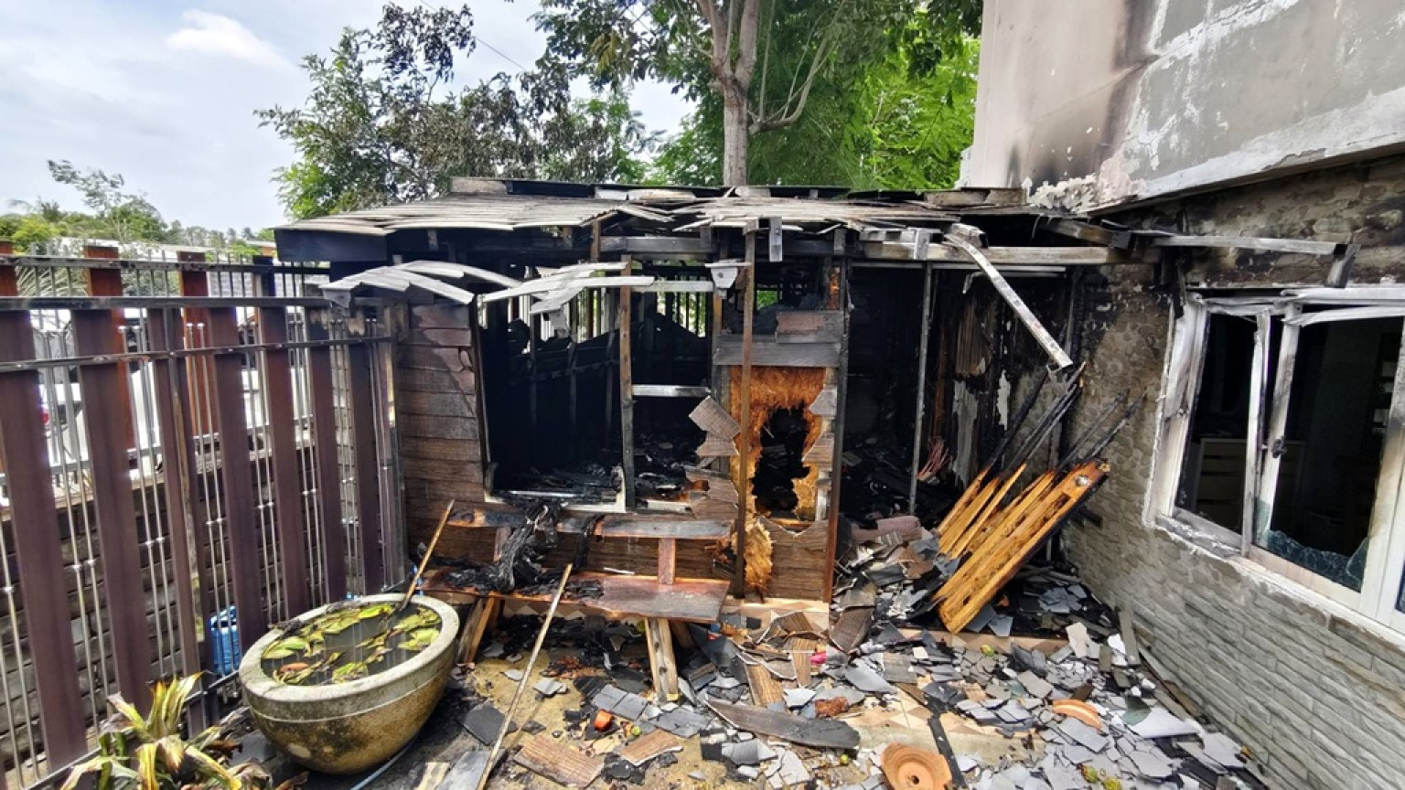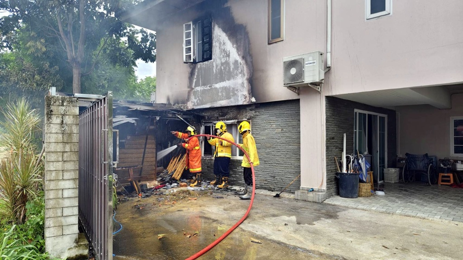 ที่เกิดเหตุ เป็นบ้านปูนสองชั้นไฟกำลังลุกไหม้ห้องนอนเล็กชั้นล่างที่อยู่ติดกับตัวบ้าน เจ้าหน้าที่ดับเพลิง จึงช่วยกันฉีดน้ำเพื่อไม่ให้ไฟลุกลามโดยใช้เวลาประมาณ 10 นาที เพลิงจึงสงบ ตรวจสอบพบว่าห้องนอนเล็กได้รับความเสียหายทั้งหมด ส่วนตัวบ้านได้รับความเสียหายเล็กน้อยจากไฟลามเลีย