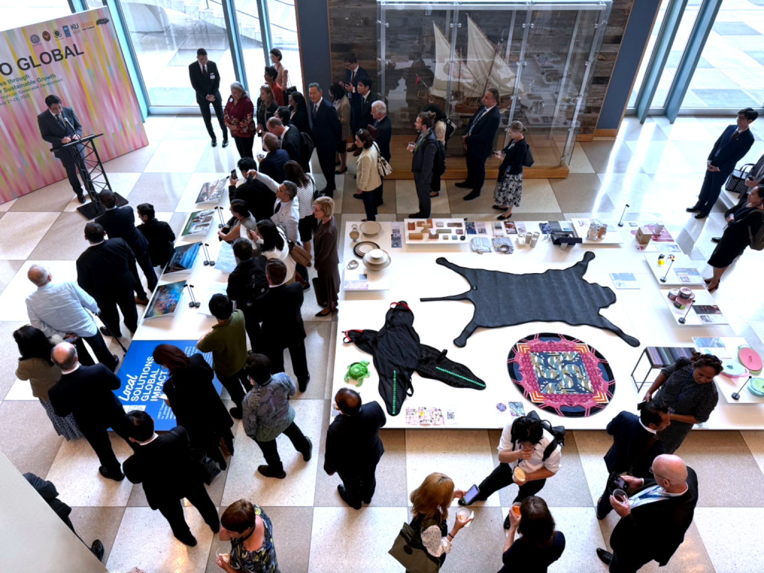 นิทรรศการ “Local to Global –Empowering Communities through Upcycled Innovation for Sustainable Growth” มีวัตถุประสงค์หลักในการมุ่งส่งเสริมและผลักดันสินค้าท้องถิ่นไทยให้สามารถแข่งขันและเติบโตในตลาดโลก ภายใต้แนวคิด “From Local to Global” โดยอาศัยกลไกความร่วมมือกับภาคีทั้งในและต่างประเทศ เพื่อสร้างโอกาสทางเศรษฐกิจและส่งเสริมศักยภาพของชุมชนและผู้ประกอบการไทย โดยไทยได้นำเสนอศักยภาพของผู้ประกอบการไทยในการสร้างสรรค์ผลิตภัณฑ์จากวัสดุเหลือใช้ (upcycle) ให้เป็นผลงานศิลปะและของใช้ในชีวิตประจำวัน โดยอาศัยภูมิปัญญาท้องถิ่นเป็นแนวทาง ซึ่งสะท้อนให้เห็นถึงแนวทางการพัฒนาเศรษฐกิจที่เชื่อมโยงมิติท้องถิ่นกับเวทีโลก อีกทั้งแสดงให้เห็นว่าไทยสามารถใช้ภูมิปัญญาท้องถิ่นและการออกแบบอย่างยั่งยืน เพื่อขับเคลื่อน SDGs และ soft power ของไทย