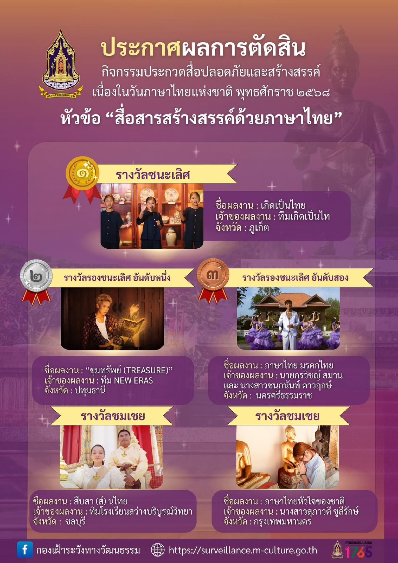 “การประกวดในปีนี้มีผลงานเข้าร่วมจำนวน 124 ผลงาน โดยเปิดรับสมัครตั้งแต่วันที่ 2 พฤษภาคม - 20 มิถุนายน 2568 และขณะนี้คณะกรรมการตัดสินการประกวดสื่อปลอดภัยและสร้างสรรค์ฯ ได้พิจารณาและประกาศผลการตัดสินเป็นที่เรียบร้อย ดังนี้ รางวัลชนะเลิศ: เพลง “เกิดเป็นไทย” ผลิตโดย ทีมเกิดเป็นไท รองชนะเลิศ อันดับ 1 : เพลง “ขุมพรัพย์ (TREASURE)” ผลิตโดย ทีม NEW ERAS รองชนะเลิศ อันดับ 2 : เพลง “ภาษาไทย มรดกไทย” ผลิตโดย นายกรวิชญ์ สมาน และนางสาวขนกนันท์ ดาวฤกษ์ และรางวัลชมเชย 2 รางวัล คือเพลง “สืบสา(ส์)นไทย” ทีมโรงเรียนสว่างบริบูรณ์วิทยา และเพลง “ภาษาไทยหัวใจของชาติ” โดย นางสาวสุภาวดี ชูลีรักษ์” ปลัด วธ. กล่าว