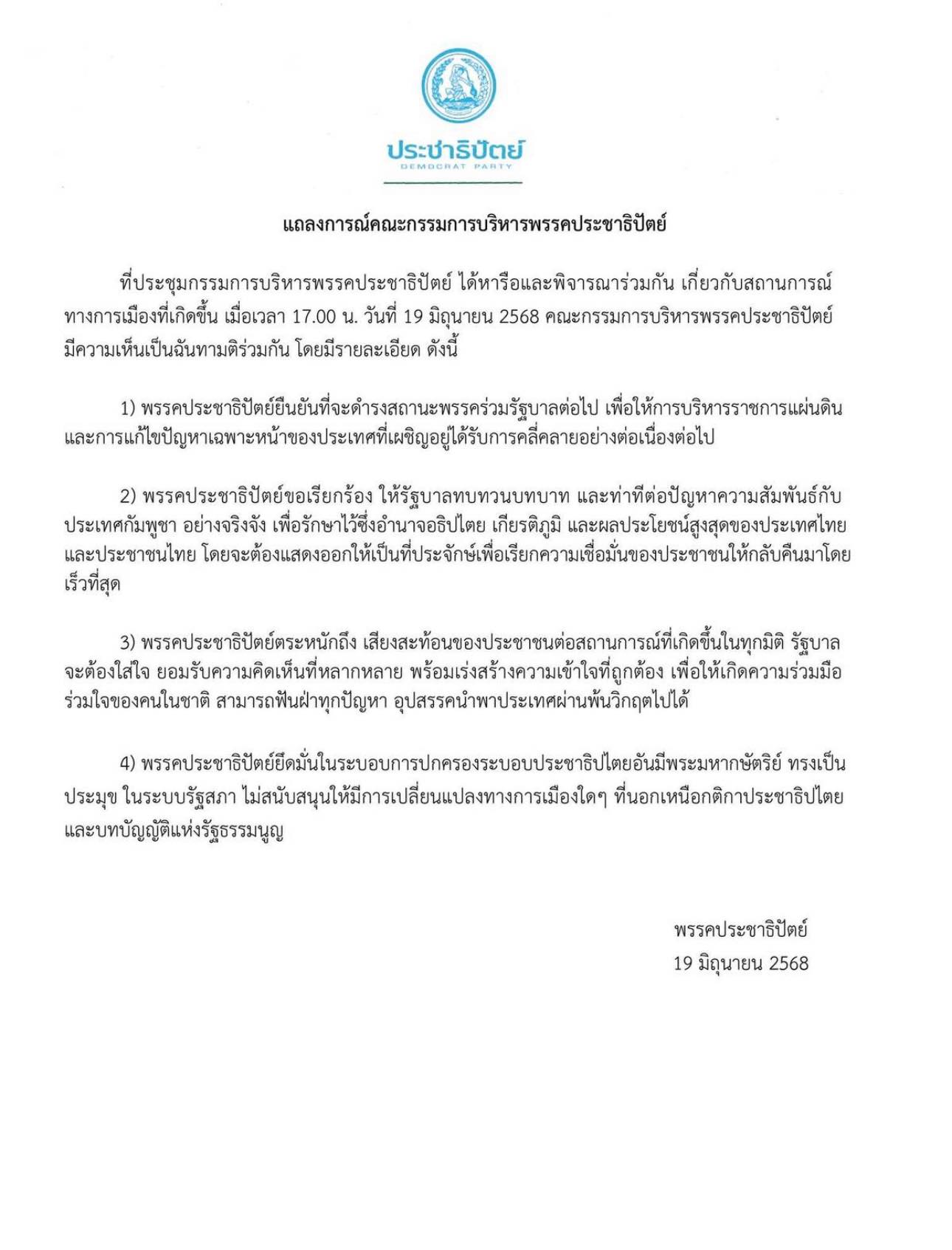 ด้านนายเดชอิศม์ ขาวทอง เลขาธิการพรรคประชาธิปัตย์ เปิดเผยว่า ขอให้รอฟังแถลงการณ์จากหัวหน้าพรรคซึ่งถือเป็นมติร่วม พร้อมย้ำว่า จุดยืนของพรรคอยู่ที่การพิจารณาของหัวหน้าพรรคเป็นหลัก ซึ่งการร่วมรัฐบาลต้องใช้เหตุผลและความเข้าใจเป็นพื้นฐานของการตัดสินใจ พร้อมระบุว่า “คนไทยต้องรู้ว่าตระกูลชินวัตรกับตระกูลฮุนเซนไม่ใช่ทีมเดียวกัน” และย้ำให้คนไทยรักกัน ร่วมมือกันฝ่าฟันอุปสรรคไปด้วยกัน