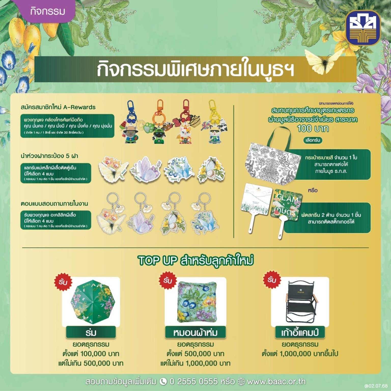 นอกจากนี้ ยังมีการจัดจำหน่ายสินค้าแกลมเกษตรสุดพรีเมียม จากเกษตรกรลูกค้า ธ.ก.ส. กว่า 70 รายการ ที่มาเปิดให้ผู้ที่สนใจได้เลือกช็อปอย่างเต็มที่ อาทิ ข้าวพร้อมทาน ตรา อุ่นอิ่ม จาก สกต.ร้อยเอ็ด สะดวก พกพาง่าย เก็บได้ในอุณหภูมิห้องได้นานถึง 18 เดือน รับประทานได้ทันที หรือจะอุ่นร้อนด้วยไมโครเวฟ เพียง 60 วินาที กาแฟลุงไข่ แบรนด์หอมละมุน by คุณฉัตร กาแฟโรบัสต้าที่เต็มไปด้วยกลิ่นหอม รสชาติเข้มข้น และมีคุณภาพส่งตรงจากแหล่งผลิตในจังหวัดชุมพร และเจลลี่สวนปทุมทิพย์ จาก จ.ลำพูน เจลลี่รสผลไม้ หอม อร่อย นุ่ม เคี้ยวเพลิน ทำจากผลไม้แท้ๆ ด้วยกระบวนการที่เป็นมิตรต่อสิ่งแวดล้อม เป็นต้น ทั้งนี้ ภายในงาน ธนาคารยังได้นำผนังกระปุก ธ.ก.ส. แห่งความทรงจำ รวมกระปุกออมทรัพย์ ธ.ก.ส. ตั้งแต่อดีตถึงปัจจุบันที่หาดูได้ยากมาให้ประชาชนได้ถ่ายรูปเป็นที่ระลึกและเข้าร่วมกิจกรรมพิเศษ เพื่อรับของที่ระลึกสุด Exclusive มากมาย ได้ที่บูธ ธ.ก.ส. ณ หาดใหญ่ ฮอลล์ ชั้น 5 และลานโปรโมชัน ชั้น 1 ศูนย์การค้าเซ็นทรัล หาดใหญ่ จังหวัดสงขลา วันที่ 4 - 6 กรกฎาคมนี้