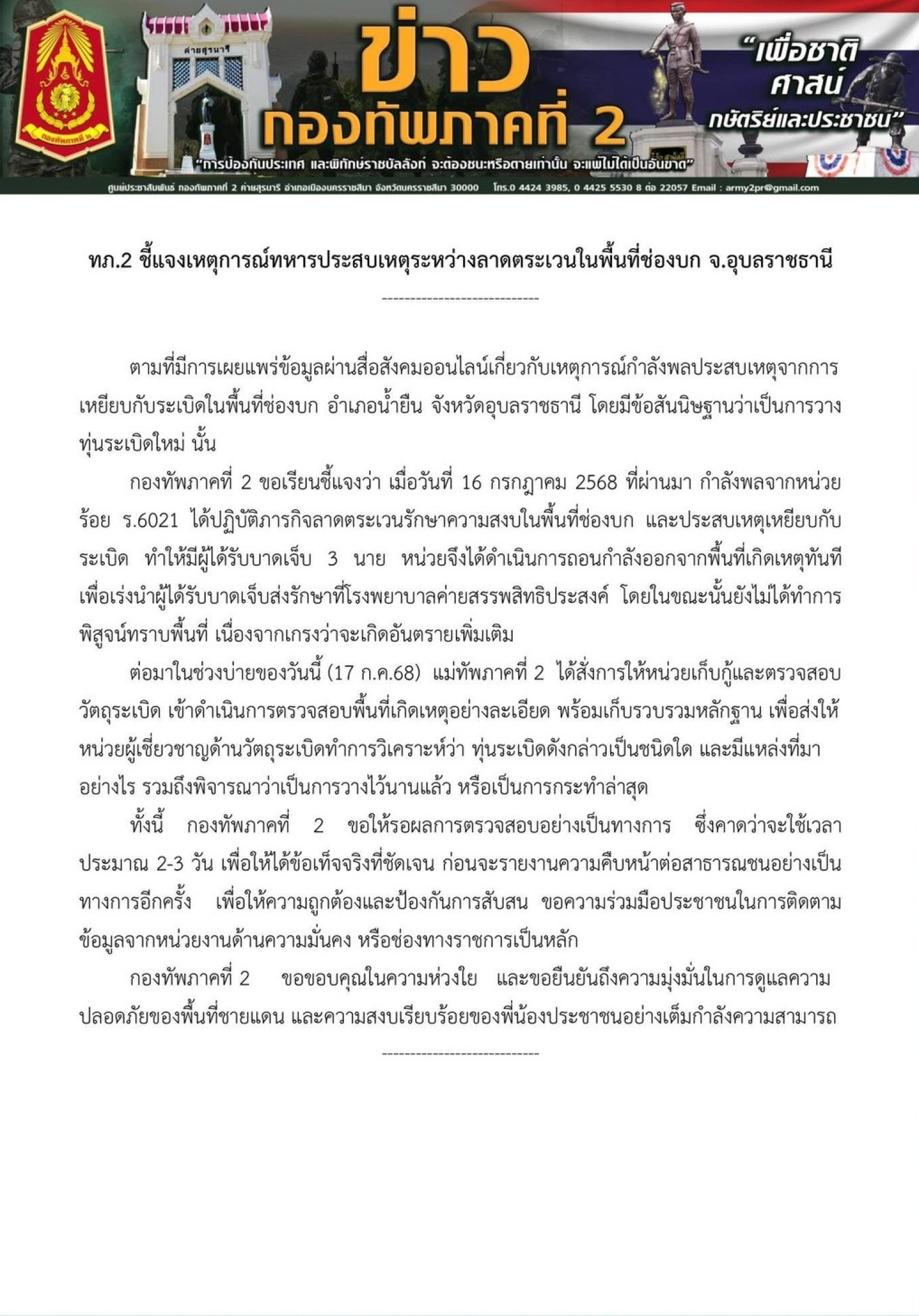 ตามที่มีการเผยแพร่ข้อมูลบนสื่อสังคมออนไลน์เกี่ยวกับเหตุการณ์ ทหารประสบเหตุเหยียบกับระเบิดในพื้นที่ช่องบก อำเภอน้ำยืน จังหวัดอุบลราชธานี พร้อมข้อสันนิษฐานว่าเป็นการวางทุ่นระเบิดใหม่ ล่าสุด กองทัพภาคที่ 2 ออกมาชี้แจงว่า