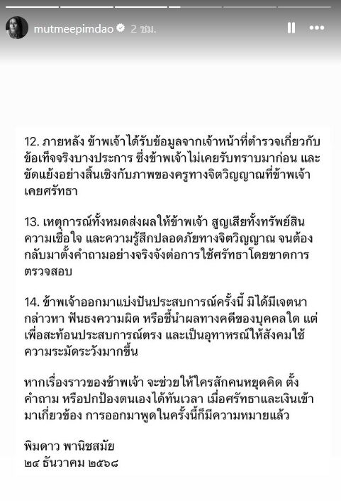 ไม่เคยรู้มาก่อนว่ามีเรื่องแบบนี้เกิดขึ้นด้วย โดยวันที่ 24 ธ.ค.68 มัดหมี่ พิมดาว โพสต์ 14 ข้อเล่าประสบการณ์ส่วนตัวของข้าพเจ้าว่า