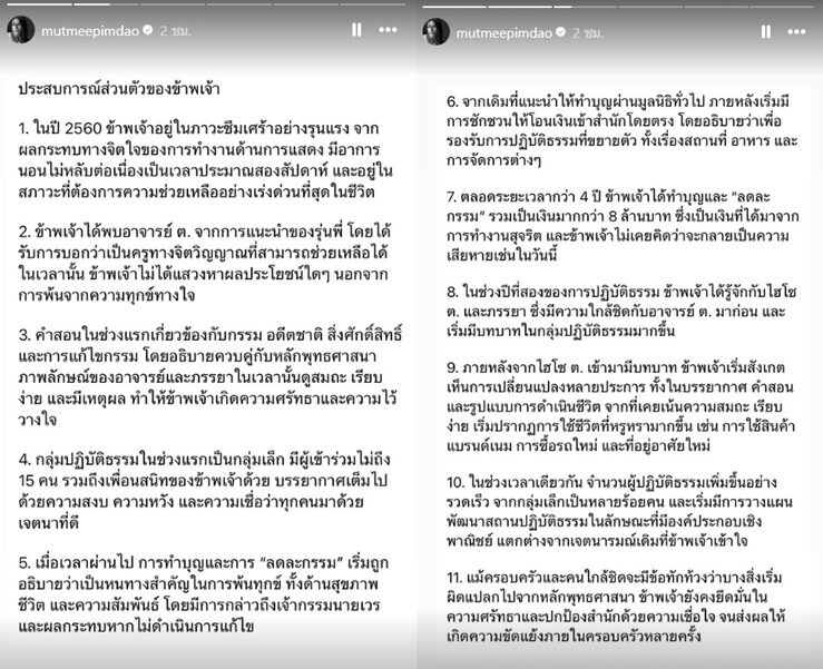 7. ตลอดระยะเวลากว่า 4 ปี ข้าพเจ้าได้ทำบุญและ “ลดละกรรม” รวมเป็นเงินมากกว่า 8 ล้านบาท ซึ่งเป็นเงินที่ได้มาจากการทำงานสุจริต และข้าพเจ้าไม่เคยคิดว่าจะกลายเป็นความเสียหายเช่นในวันนี้