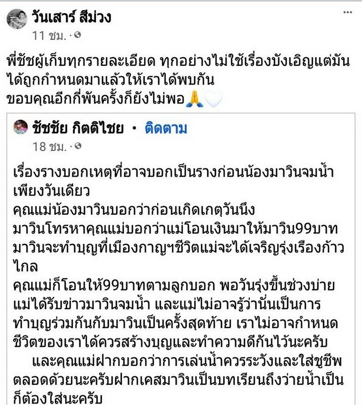 พอวันรุ่งขึ้นช่วงบ่ายแม่ได้รับข่าว มาวิน จมน้ำ และแม่ไม่อาจรู้ว่านั่นเป็นการทำบุญร่วมกันกับมาวินเป็นครั้งสุดท้าย เราไม่อาจกำหนดชีวิตของเราได้ ควรสร้างบุญและทำความดีกันไว้นะครับ และคุณแม่ฝากบอกว่า การเล่นน้ำควรระวังและใส่ชูชีพตลอดด้วยนะครับ ฝากเคสมาวินเป็นบทเรียนถึงว่ายน้ำเป็นก็ต้องใส่นะครับ"