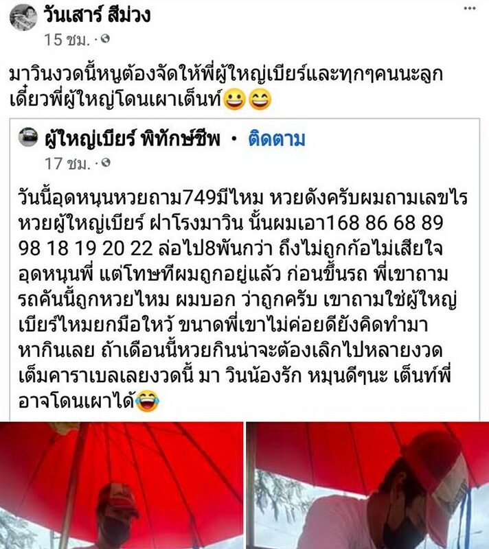 "วันนี้อุดหนุนหวย ถาม 749 มีไหม หวยดังครับ ผมถามเลขไรหวยผู้ใหญ่เบียร์ ฝาโรงมาวิน งั้นผมเอา 168 86 68 89 98 18 19 20 22 ล่อไป 8 พันกว่า ถึงไม่ถูกก็ไม่เสียใจอุดหนุนพี่ แต่โทษทีผมถูกอยู่แล้ว ก่อนขึ้นรถ พี่เขาถาม รถคันนี้ถูกหวยไหม ผมบอก ว่าถูกครับ เขาถามใช่ผู้ใหญ่เบียร์ไหม ยกมือไหว้ ขนาดพี่เขาไม่ค่อยดียังคิดทำมาหากินเลย ถ้าเดือนนี้หวยกินน่าจะต้องเลิกไปหลายงวด เต็มคาราเบลเลยงวดนี้ มา วินน้องรัก หมุนดี ๆ นะ เต็นท์พี่อาจโดนเผาได้"
