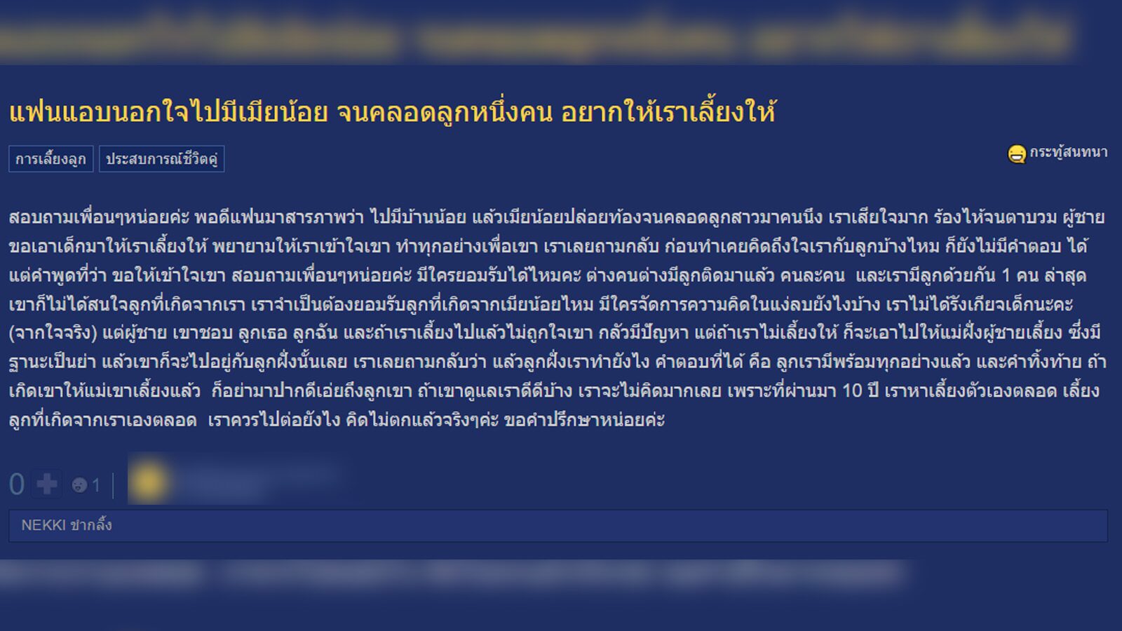 โดยสาวเจ้าของกระทู้เล่าว่า เธอกับสามีต่างมีลูกติดฝั่งละคน และเธอกับเขาก็ยังมีลูกด้วยกัน 1 คน เร็วๆ นี้ เขาสารภาพว่าได้นอกใจไปมีภรรยาน้อยและมีลูกสาวด้วยกัน 1 คน อยากเอาเด็กมาให้เธอช่วยเลี้ยง เขาพยายามพูดให้เธอเข้าใจ เธอจึงถามกลับไปว่า แล้วเขาเคยนึกถึงจิตใจเธอกับลูกบ้างไหม? ซึ่งคำตอบที่ได้ก็คือความเงียบ