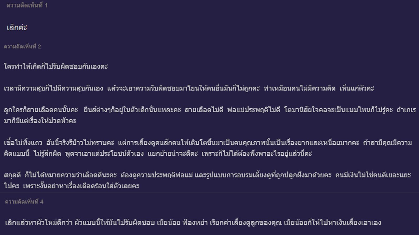 อ้างอิงจากข้อมูลในกระทู้ สามีของเธอแทบจะไม่มีข้อดีเลย ทั้งนอกใจ ไม่เลี้ยงดูและไม่ใส่ใจ อีกทั้งเจ้าของกระทู้ดูไม่จำเป็นต้องพึ่งพาเขาขนาดนั้น เพราะหาเลี้ยงตัวเองได้ ดังนั้นการเลิกกันจึงเป็นทางออกที่ดีที่สุด