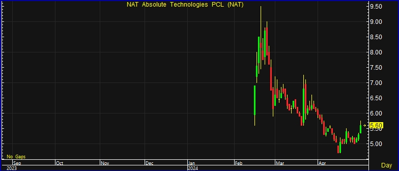 ผู้สื่อข่าวรายงานว่าวันนี้ (8 พ.ค.67) ราคาหุ้น บริษัท แนท แอบโซลูท เทคโนโลยีส์ จำกัด (มหาชน) หรือ NAT ณ เวลา 10:48 อยู่ที่ระดับ 5.60 บาท บวก 0.30 บาท หรือ 5.66% ราคาสูงสุด 5.75 บาท ราคาต่ำสุด 5.35 บาท ด้วยมูลค่าซื้อขาย 23.69 ล้านบาท
