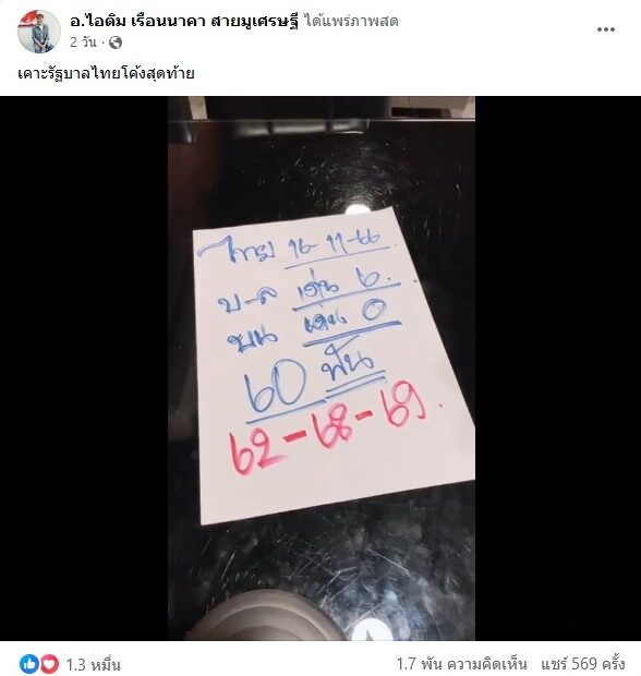 โดย อ.ไอติม ยังไลฟ์สด เคาะรัฐบาลไทยโค้งสุดท้าย ทางเพจ อ.ไอติม เรือนนาคา สายมูเศรษฐี เผยเลขเด็ดเลขที่ชอบมากๆงวดนี้ยังเน้นย้ำ 6 มาแน่และฟันเลขเด็ด 60