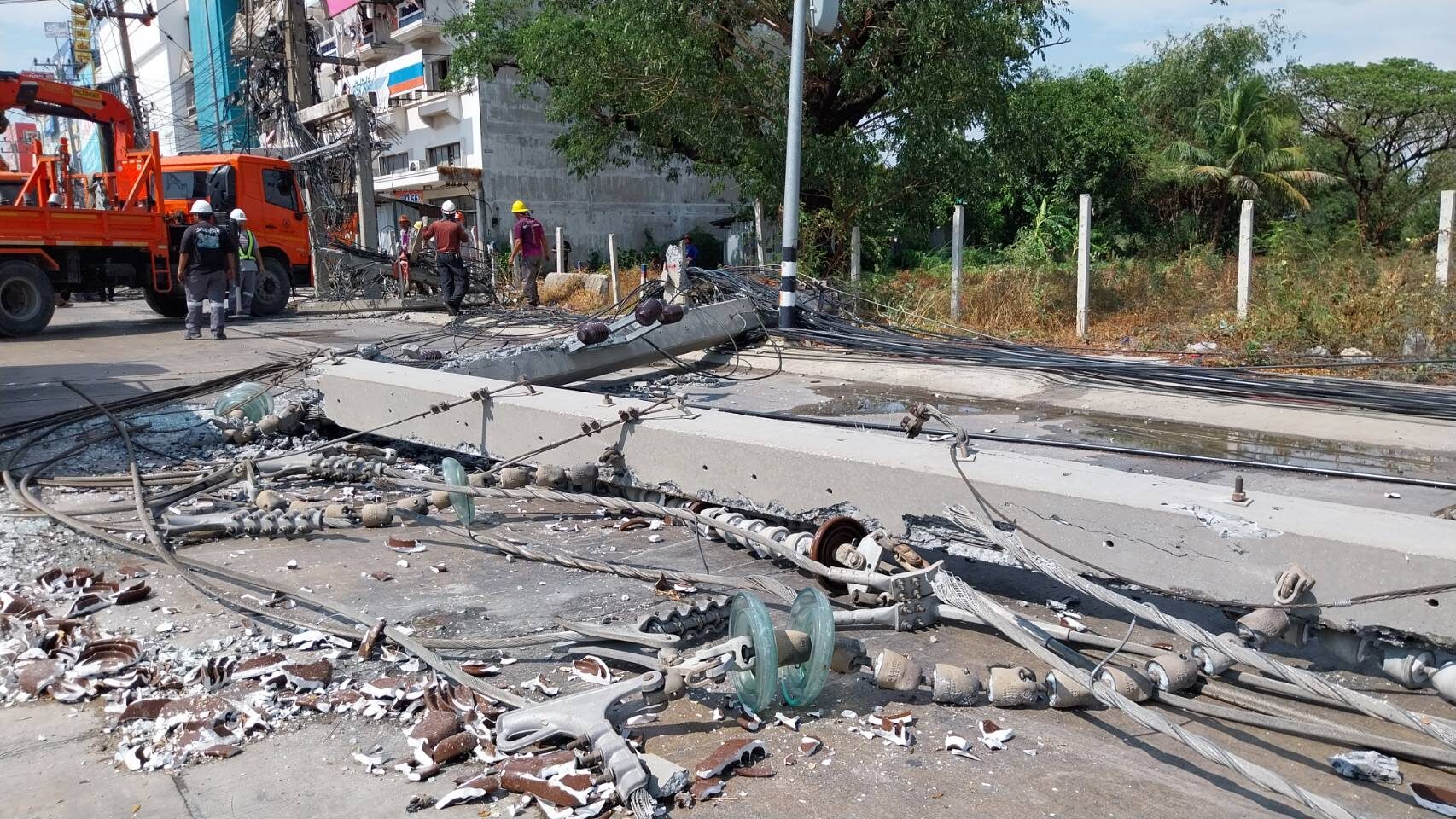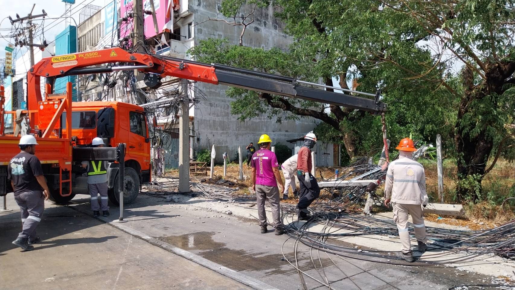 ระทึก พายุถล่ม-ลมกระโชกแรง ฟ้าผ่าเสาไฟแรงสูง หัก 3 ต้น กีดขวางการจราจร เจ้าของร้านปะยาง เล่านาที เสียงดังสนั่น หันไปดูเห็นเสาไฟล้ม