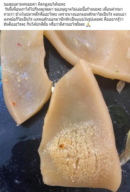 กรณี มีผู้โพสต์ตั้งคำถามกับ ลักษณะของปลาหมึก ในร้านหมูจุ่มแห่งหนึ่ง ลงในกลุ่มLampang City ว่าปลาหมึกที่มีจุดขาวๆเช่นนั้นสามารถรับประทานได้หรือไม่