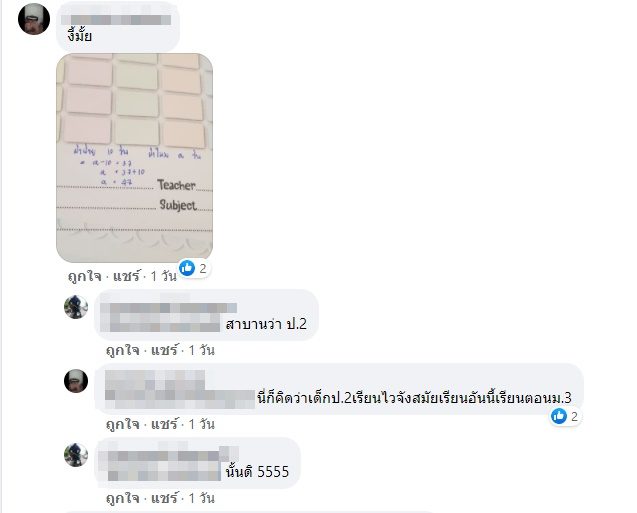 เป็นโพสต์ที่ทำให้ชาวเน็ตร่วมถกเถียงกันอย่างหนัก ถึงเรื่องการศึกษาของเด็กชั้นประถม หลังจากมีผู้ปกครองรายหนึ่ง ได้โพสต์แบบฝึกหัดรายวิชาพื้นฐาน คณิตศาสตร์ ป.2 ซึ่งเป็นโจทย์เกี่ยวกับสมการเรื่องของเวลา