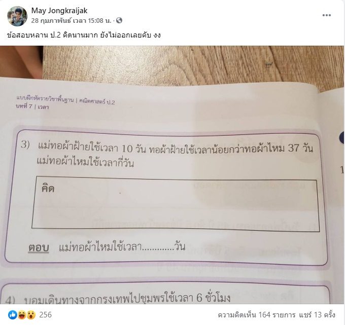 โดยโจทย์ระบุว่า "แม่ทอผ้าฝ้ายใช้เวลา 10 วัน ทอผ้าฝ้ายใช้เวลาน้อยกว่าผ้าไหม 37 วัน แม่ทอผ้าไหมใช้เวลากี่วัน" ซึ่งผู้ปกครองได้ระบุว่า "ข้อสอบหลาน ป.2 คิดนานมาก ยังไม่ออกเลยคับ งง"